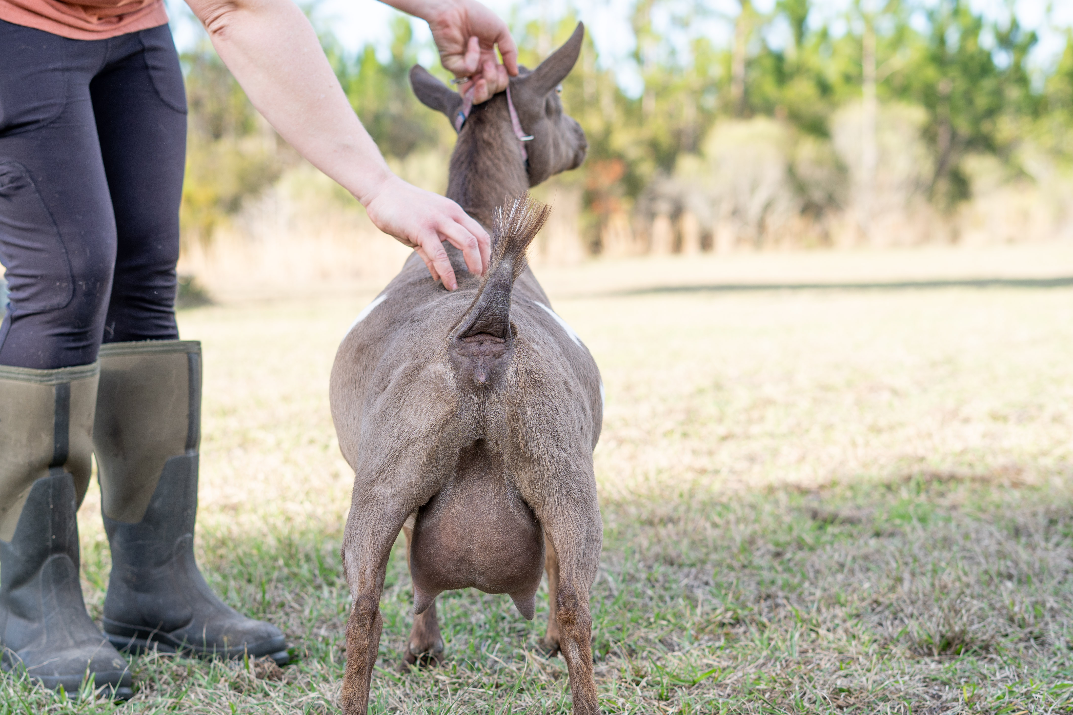 Nell came to us in 2020, before we knew anything about goats. She gave us two bucklings in 2021, and then a single doe in November 2022. Her first image is at Mini Madness in Feb 2022. She had a lovely rounded udder and an improved FU and RU attachment (compared to her maternal sister). Her medial didn’t come in well until about two weeks following the show. So, though we didn’t place as well as hoped, the exposure for her was good. She is our best goat in the ring as far as demeanor (her RBF is something serious though- she hates shows). The second set of images is her udder following a single kid. We were unable to milk her immediately, so this was a month following kidding. We still chose to have something to display for the page, regardless of how “good” it looks. She has great udder capacity and her udder texture is buttery smooth as well. We know this comes from Rev CQuinn’s genetics and we are so excited to have her here on our farm. She milks down to absolutely nothing, and though her teats are average size, the orifices allow such good flow. She is my favorite goat to hand milk. She will be on milk test in 2024.